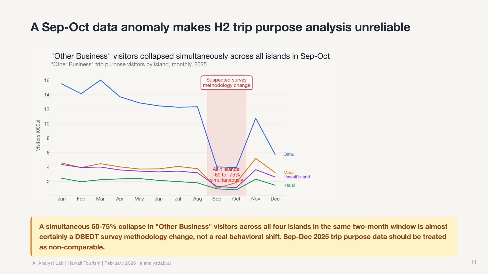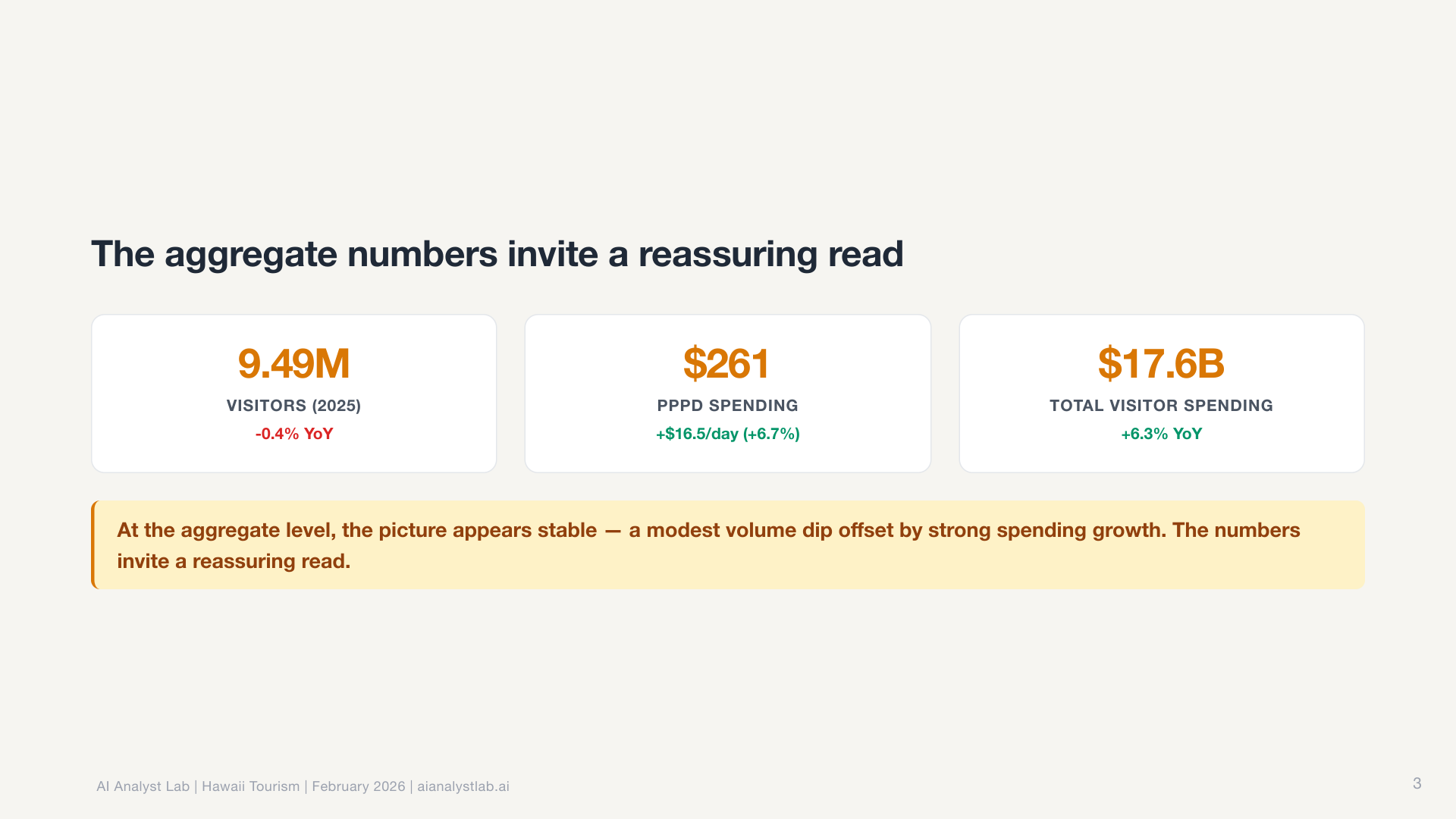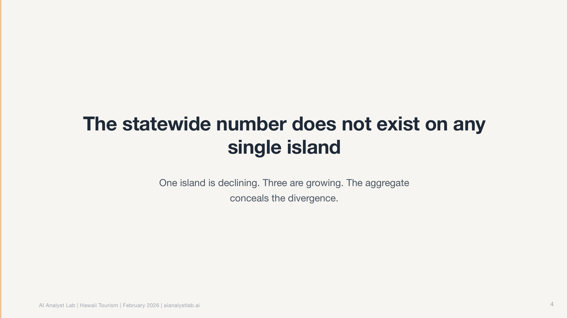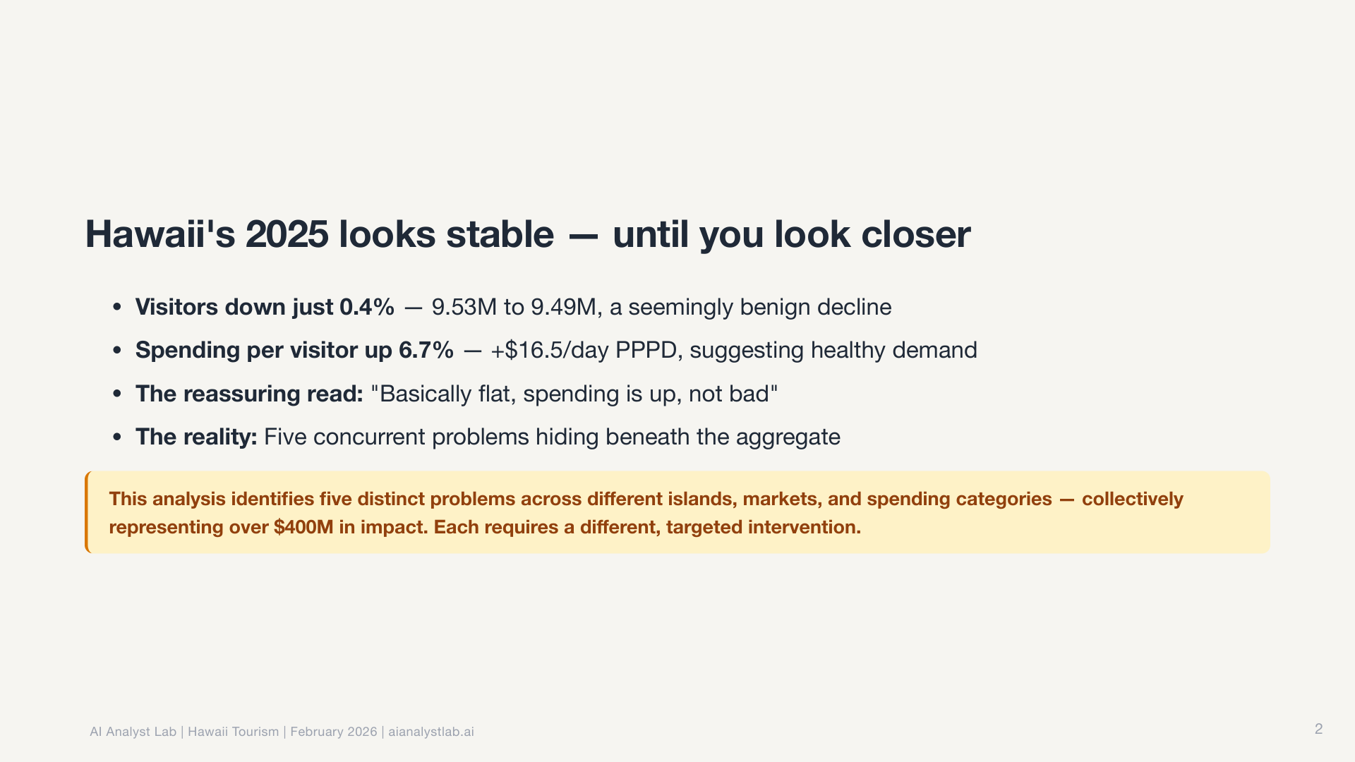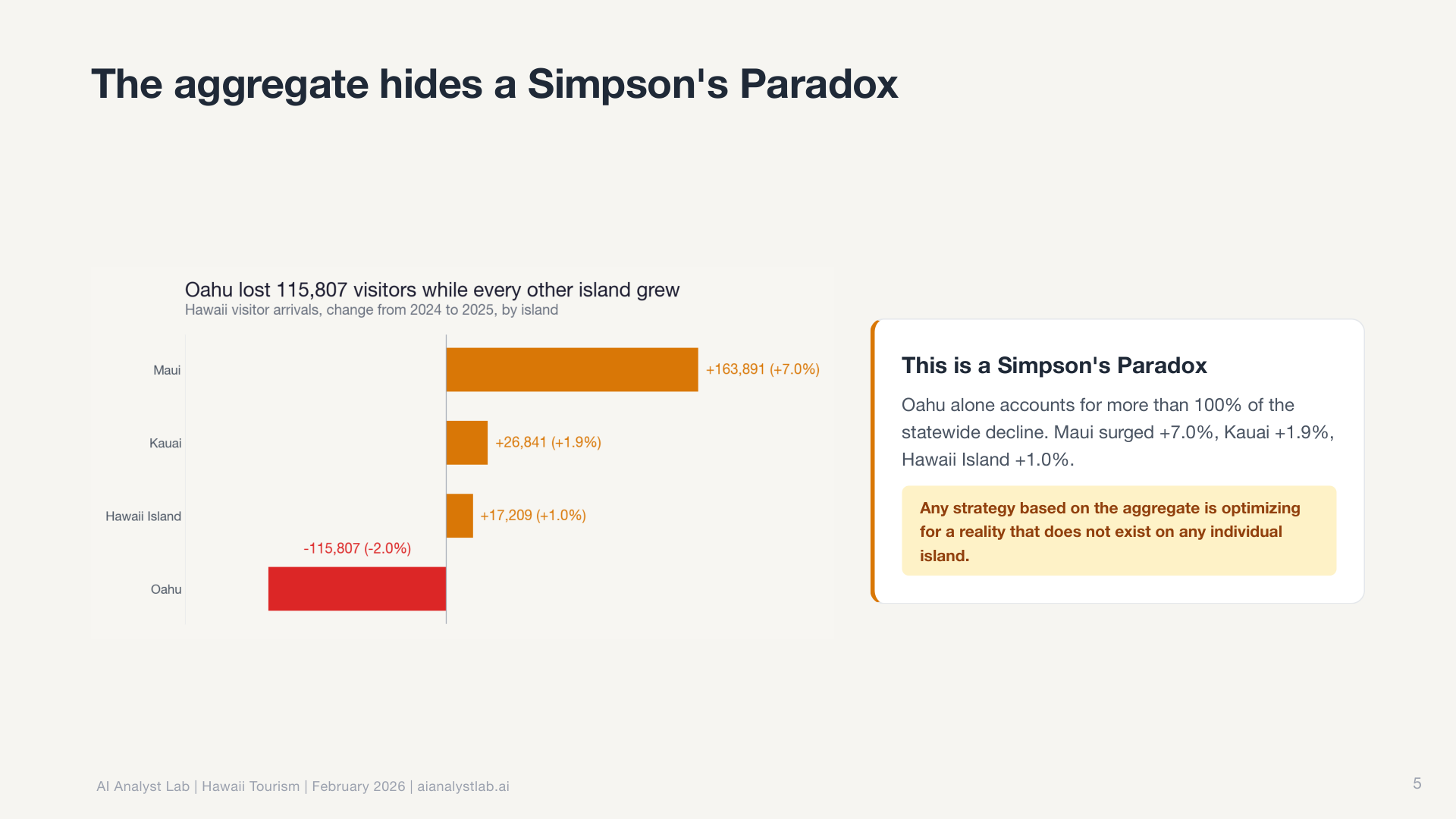 In the Hawaii data, the statewide visitor count was essentially flat. Down 0.4% year over year. Most tools would report “no significant change” and move on.