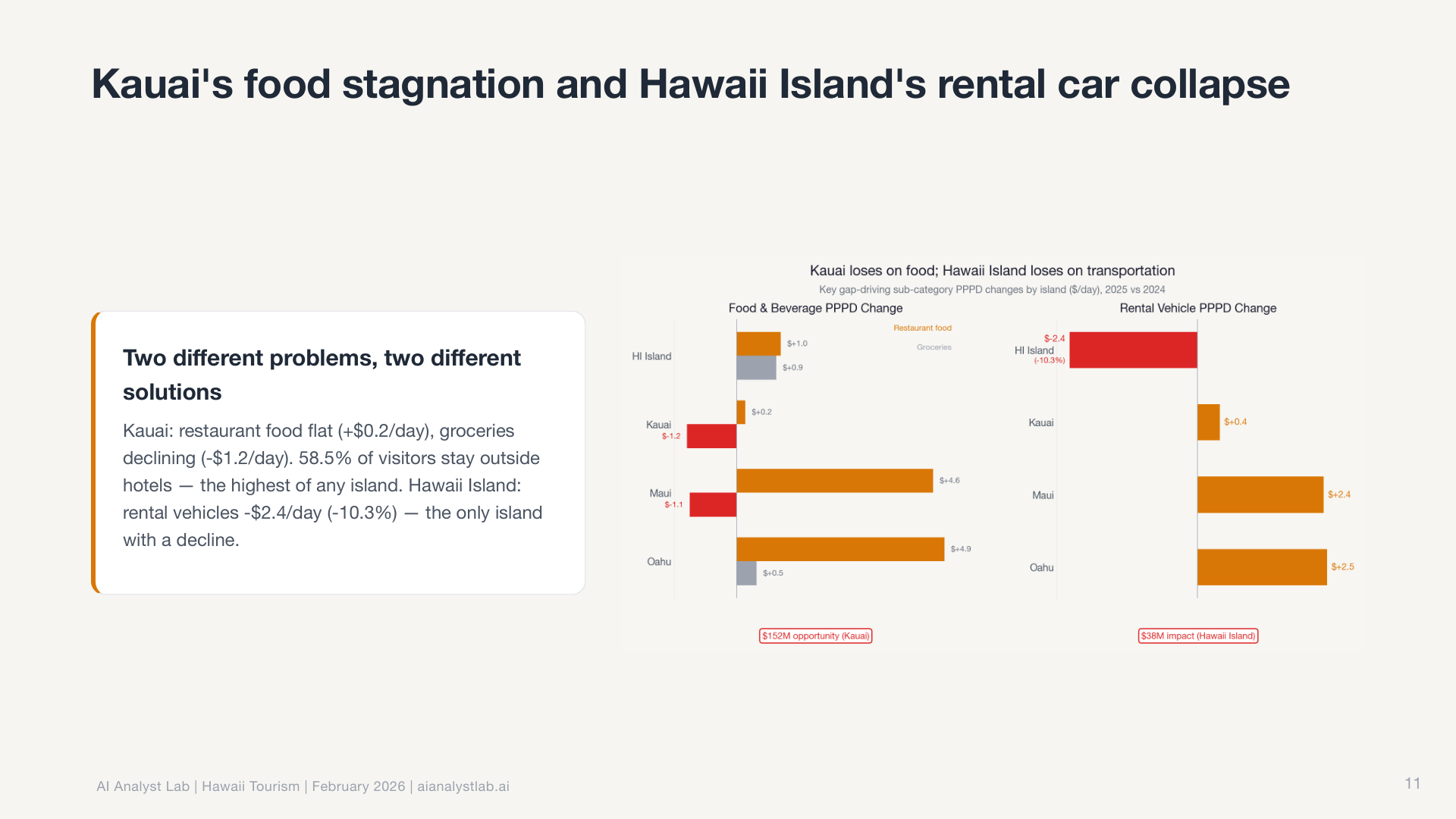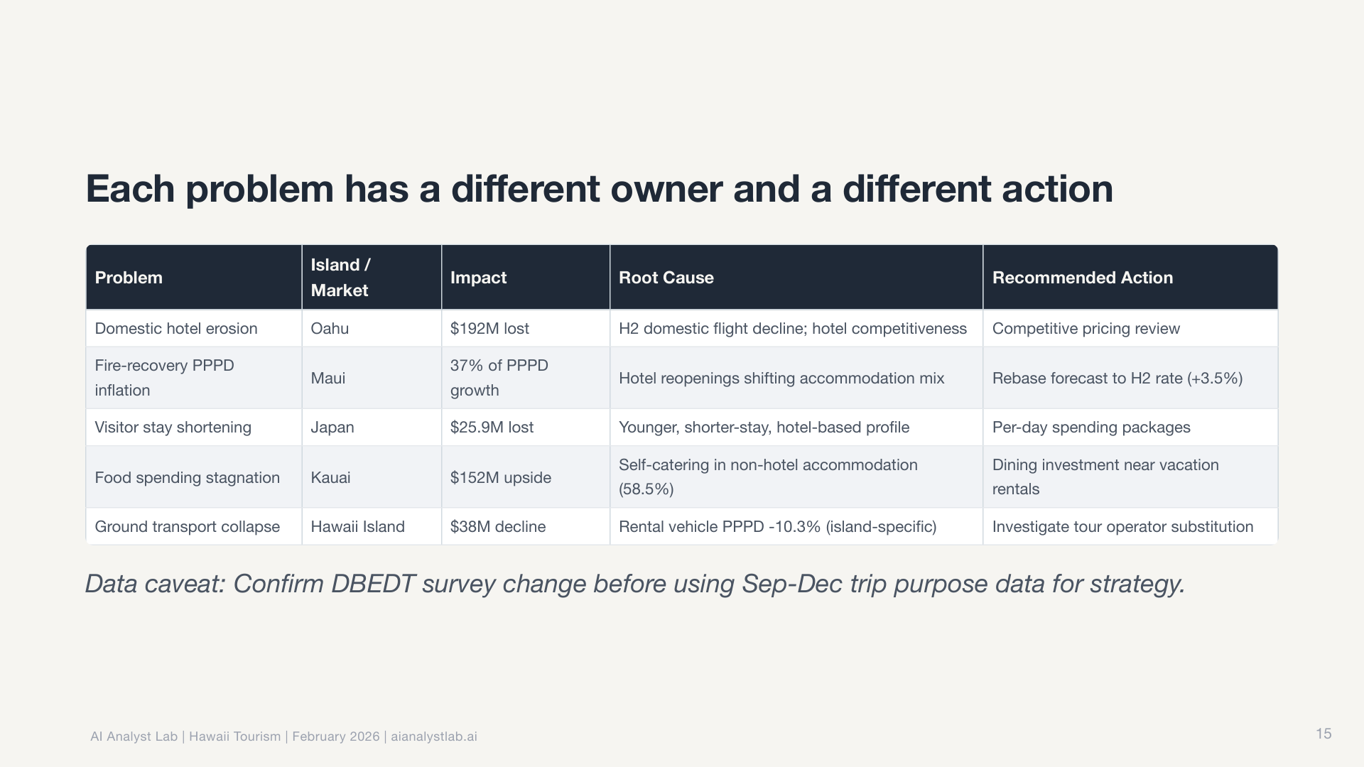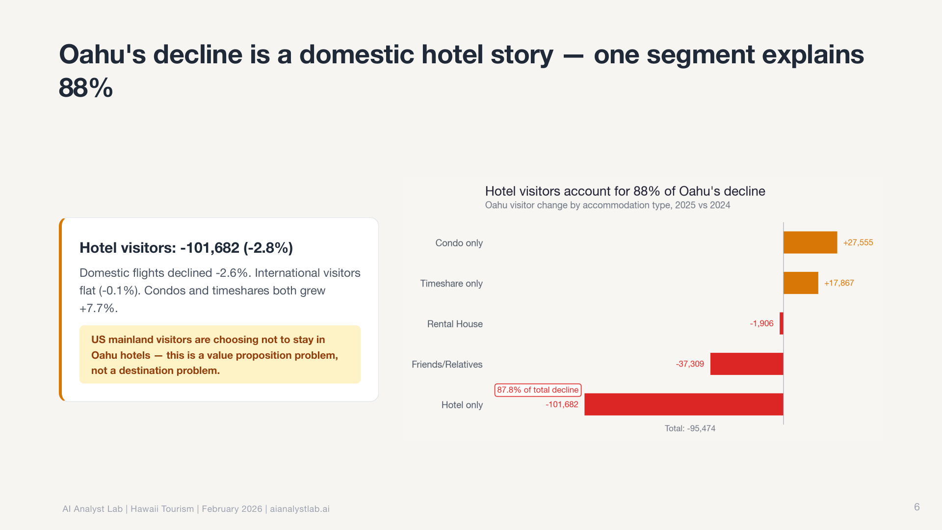 Then it decomposed O’ahu’s decline by accommodation type, finding that hotel visitors drove the loss while vacation rentals held steady.