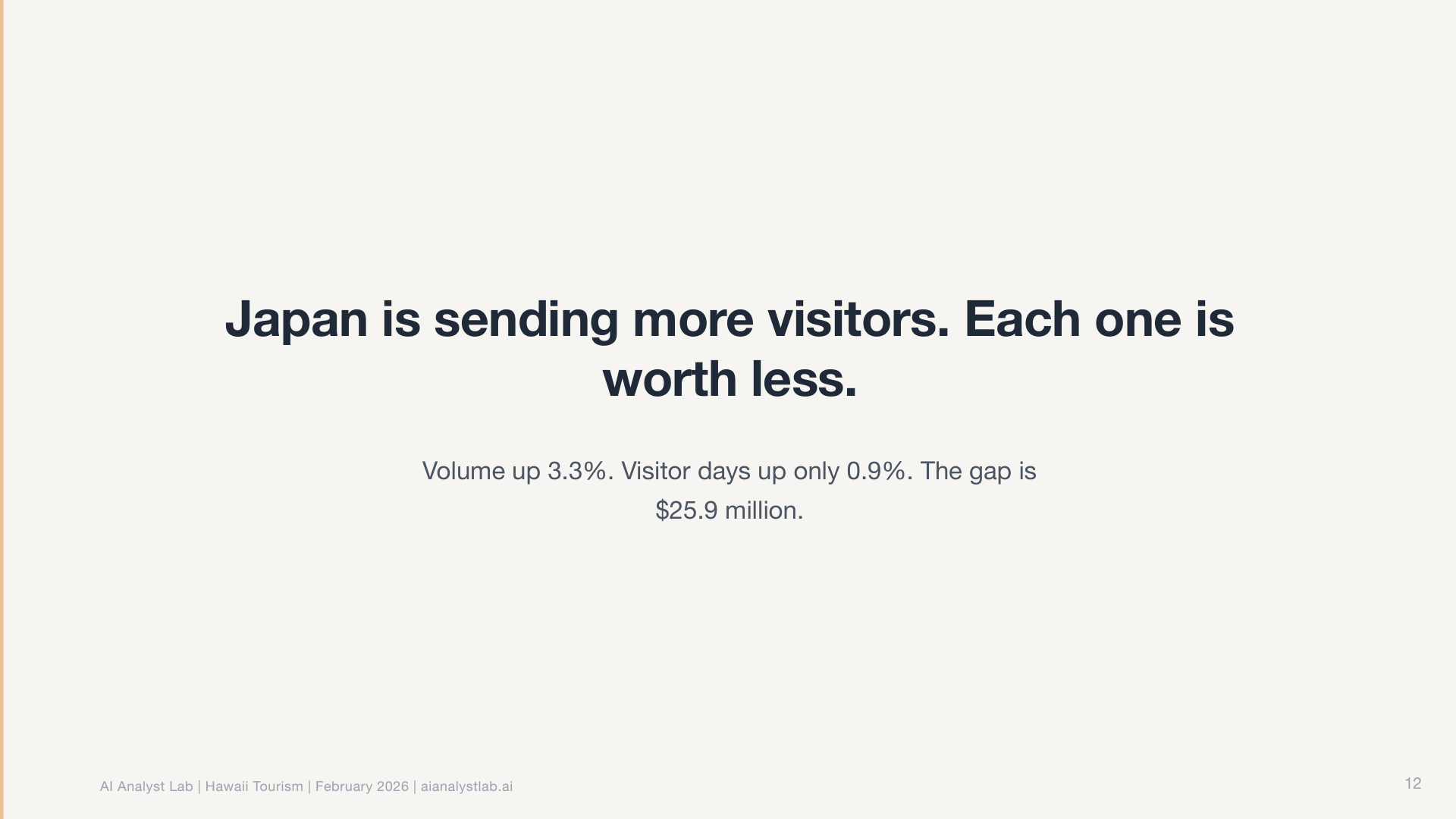 I pointed it at Hawaii Tourism Authority data and said “go analyze this.” Monthly visitor arrivals by island, country of origin, and airline capacity, 2024 vs 2025. That was my entire prompt.
